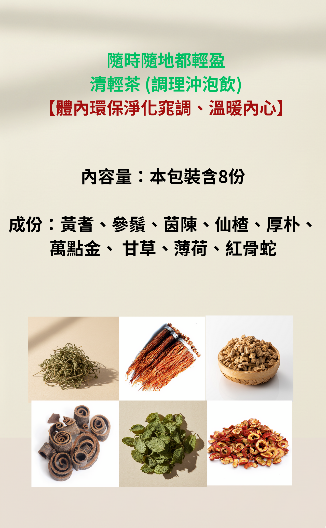 內含:黃耆、參鬚、茵陳、仙楂、厚朴、萬點金、 甘草、薄荷、紅骨蛇